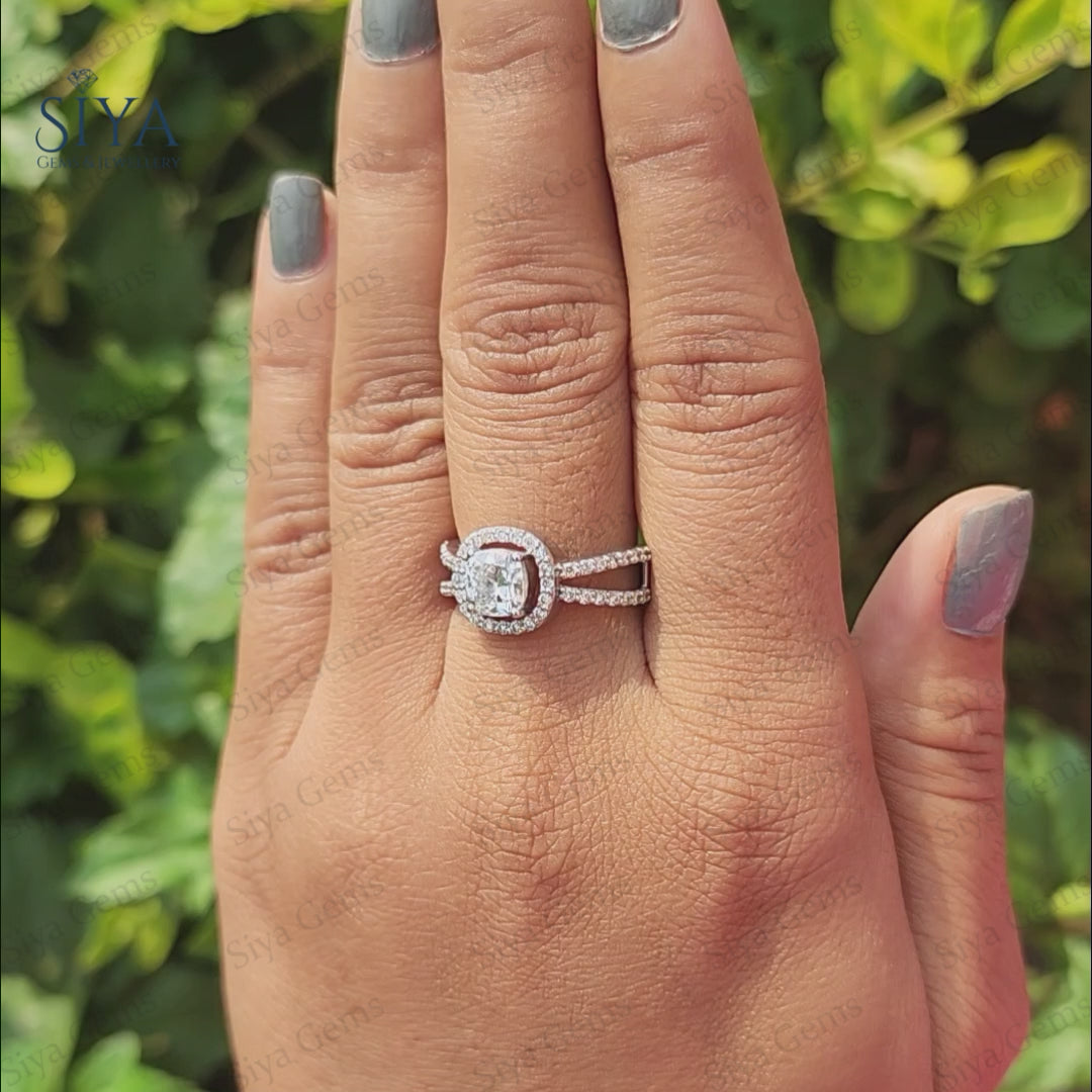 Kissenschliff Moissanit Diamant Ring Kissen Halo Verlobungsring 18K Weißgold Split Shank Brautring Ethischer zierlicher Ring Jubiläumsgeschenke
