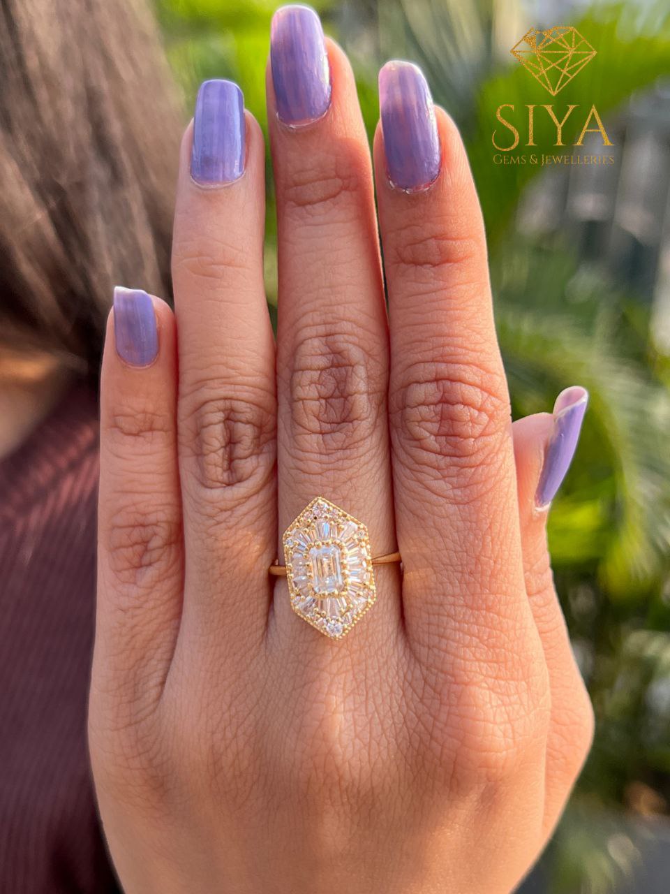 Sechseckiger Mosaikring mit Smaragdschliff und im Labor gezüchtetem Diamanten, Baguette- und runder Verlobungsring